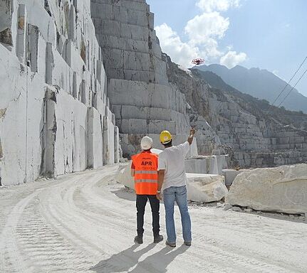 Drone-assisted inspection of rock slope stability in a marble quarry.